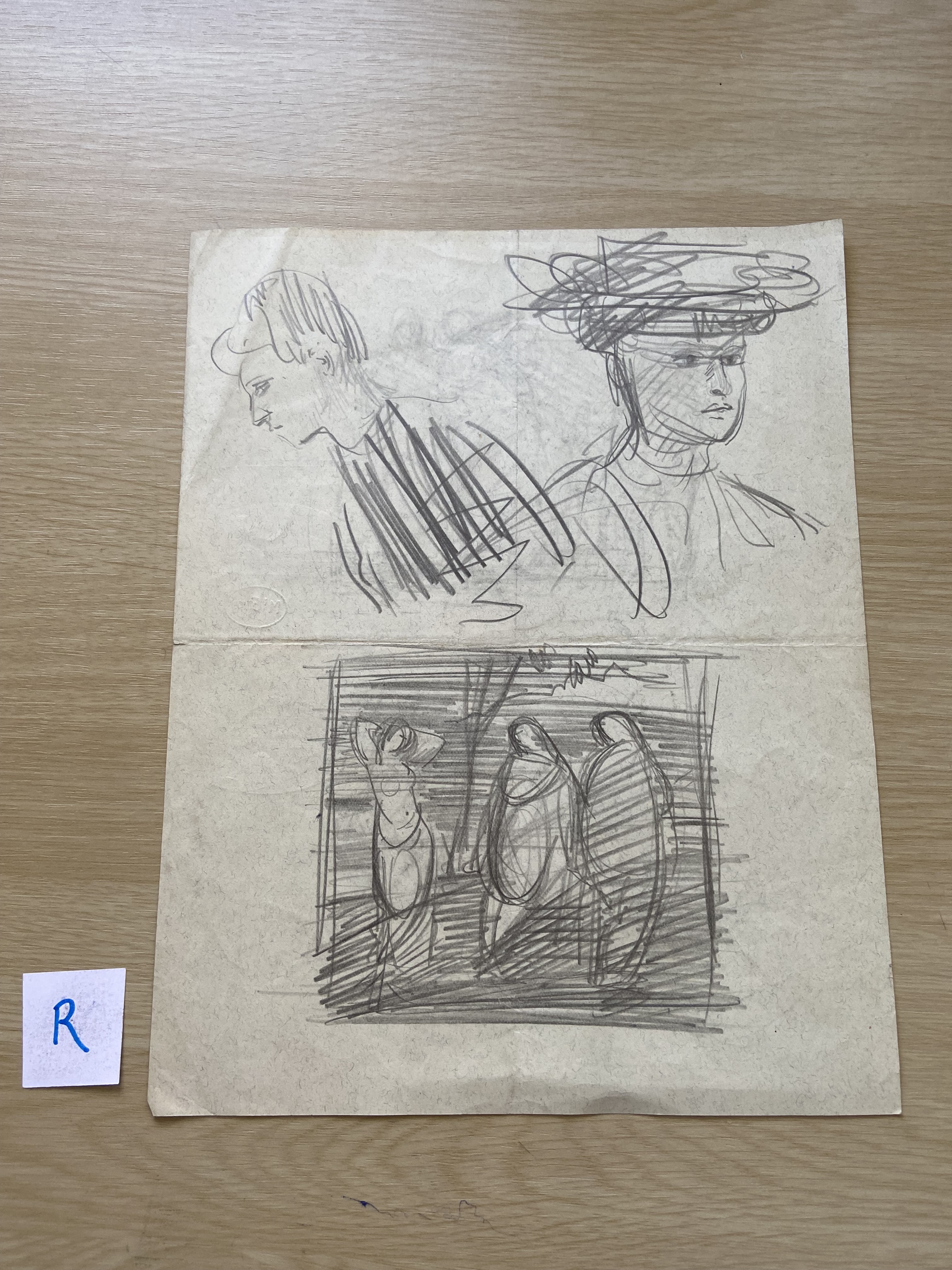 folded double notebook page, Various drawings,