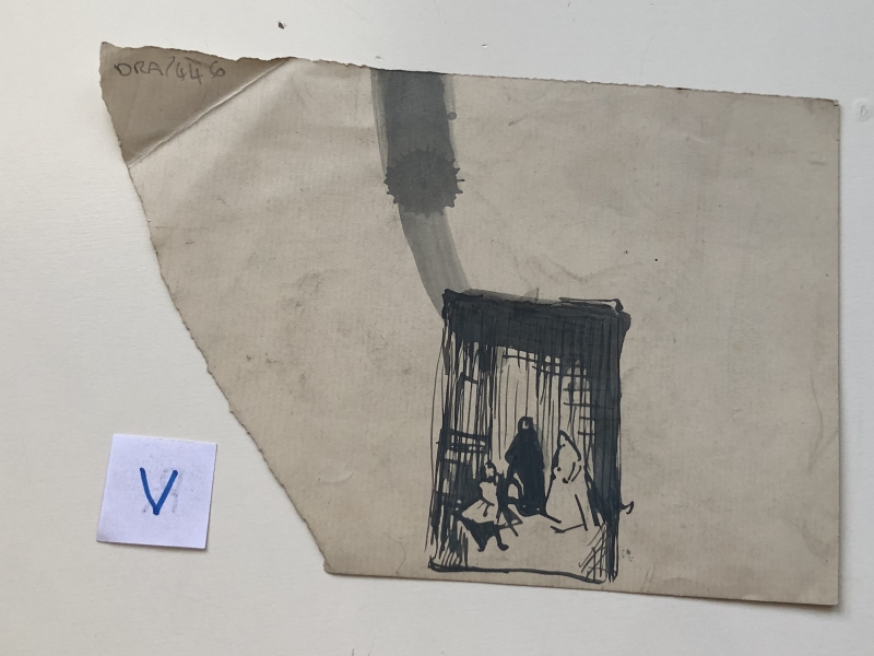 R: Pen, ink & wash sketch of AugustusJohn seated drawing V: sketches of figures, bleed through from R
