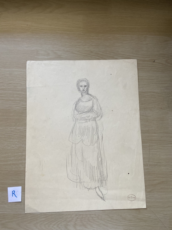 1/2 length drawing of a young lady in profile, head sightly turned towards viewer. right hand raise to shoulder studio stamp