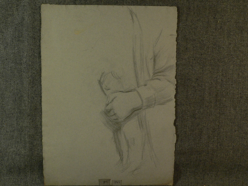 pencil study of a left hand, holding left arm. Pencil on grey blue paper.