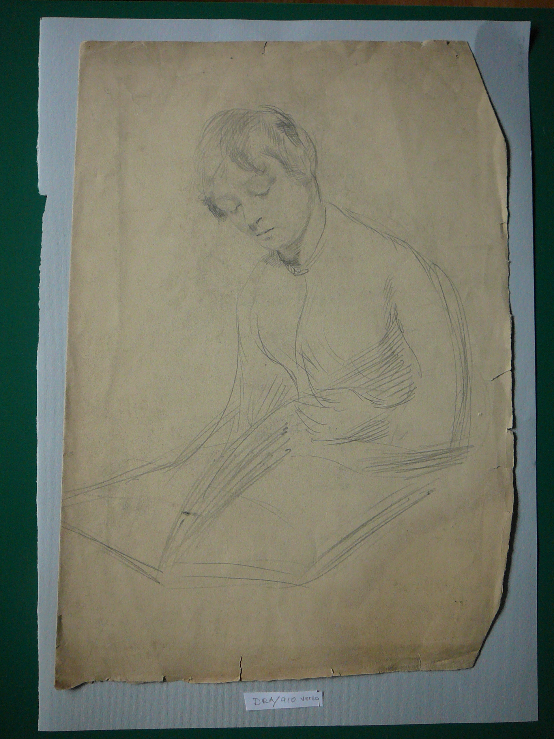 Recto: Pencil drawing on yellowed paper of a seated lady with a large book on her lap, short hair.